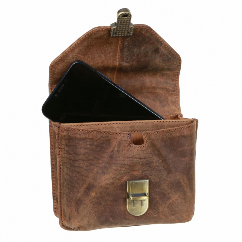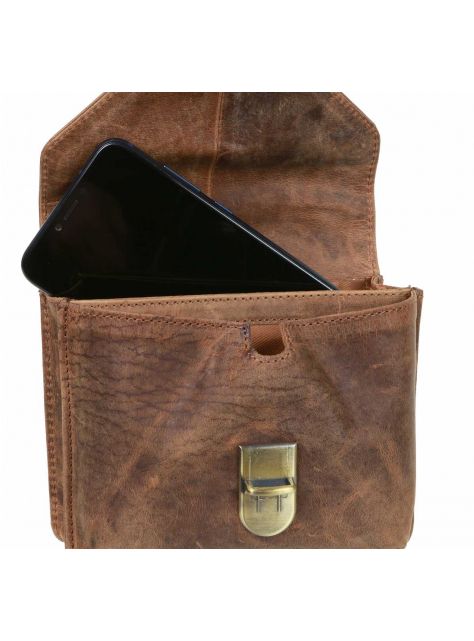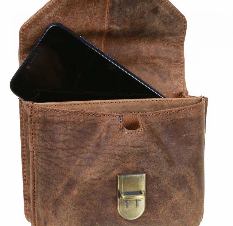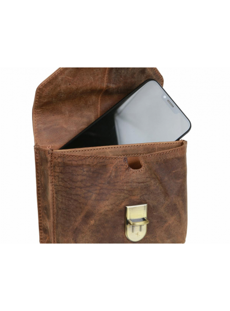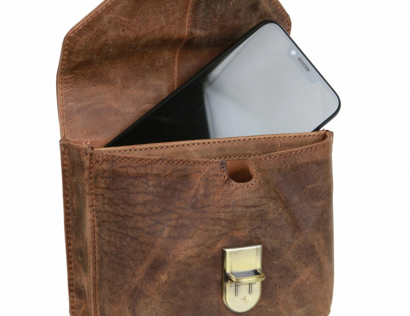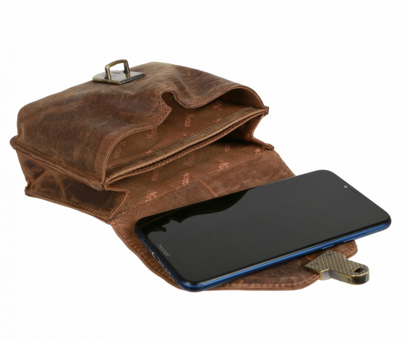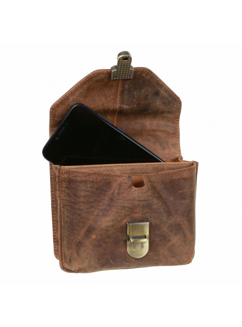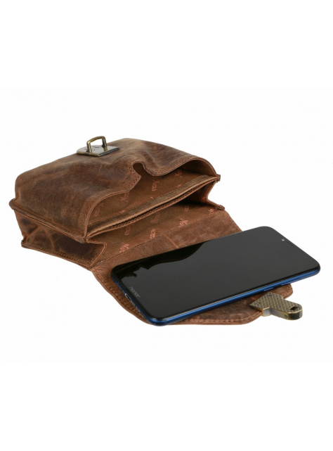 Vyrobené z hladko brúsenej kože s mramorovanou úpravou povrchu.Taštička vhodná pre menšie predmety - kľúče, mobil (max. výška mobilu 16,5 cm), peňaženka a pod. Kožené pútko na zadnej strane vyhovuje pre opasok šírky do 5,5 - 6 cm.