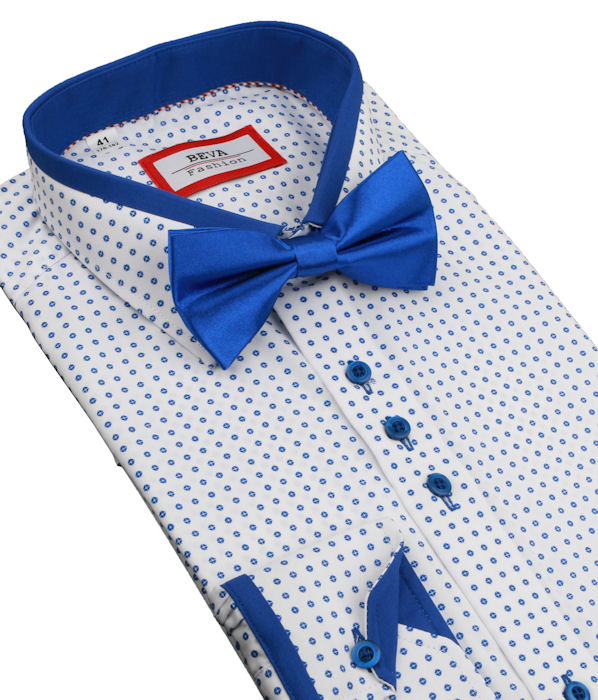 Extravagantná pánska košeľa zn. BEVA FASHION v slim strihu. Snehobiela košeľa so zvýraznenými detailami na golieri a manžetách v parížskej modrej farbe. Košeľa na výšku 176 - 182 cm.