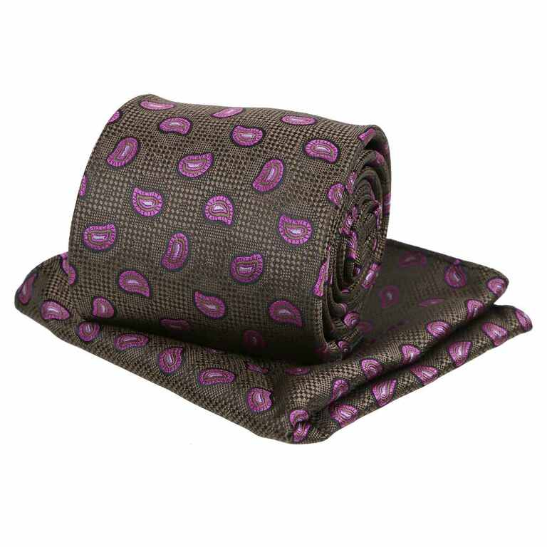 Kravatový set značky ORSI v hnedej farbe s fialovo-ružovým paisley vzorom.