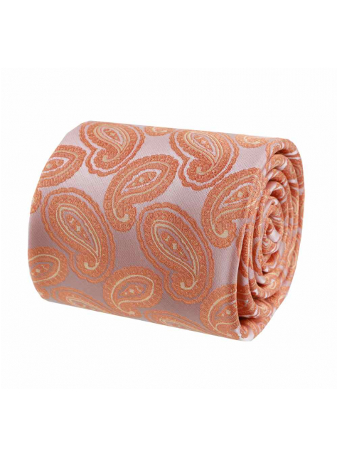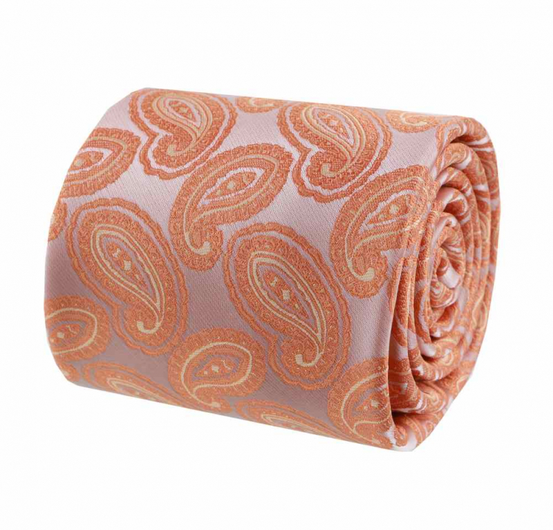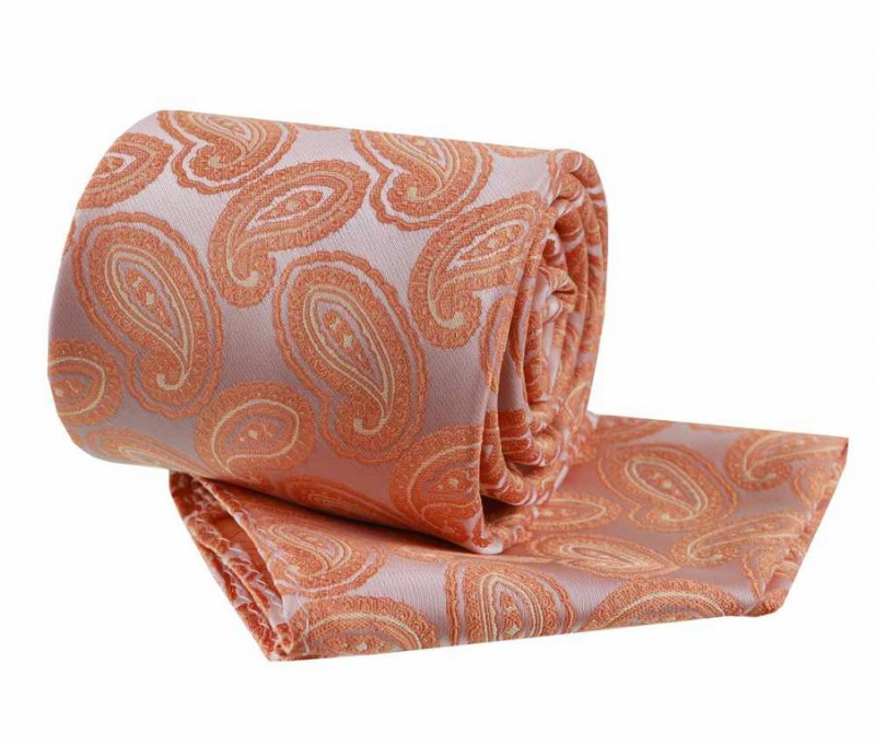 Spoločenský set značky ORSI v príjemnej oranžovo-marhuľovej farbe s perleťovým odleskom. Súprava kravaty a vreckovky do saka s paisley, šírka kravaty 8 cm.