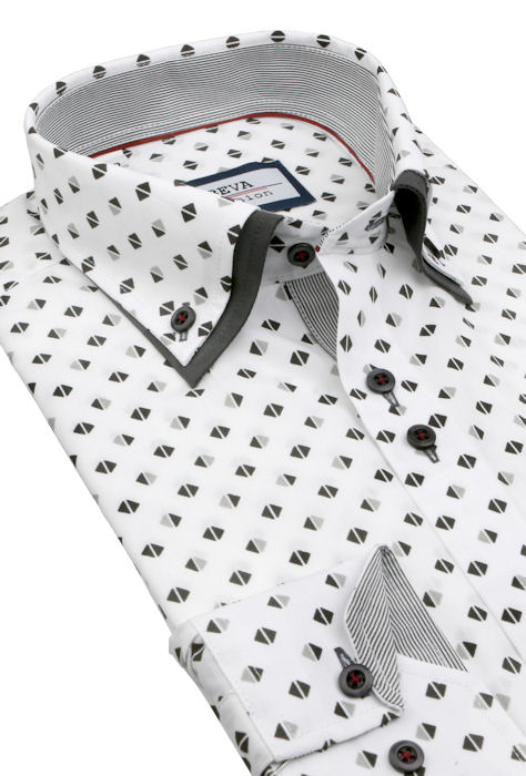 Ponúkame Vám trendovú pánsku košeľu zn. BEVA FASHION v slim strihu. Biela košeľa so šedými kontrastmi a výrazným vzorom.
