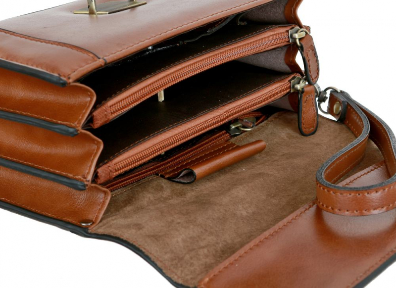 Materiál - hovädzia koža, pevné prevedenie, okrajové prešívanie, vnútro - na spodnej (najviac namáhanej) časti poklopu je brúsená koža (jelenica), vnútro - koža a textilná podšívka
