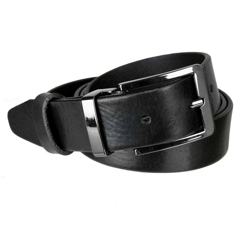 Remeň - pravá koža v čiernom prevedení, šírka 2,8 cm, h 3 mm s pevnou a extra poddajnou úpravou, povrch zmatnený, hladký s prirodzenou jemne vráščitou štruktúrou, okraje bez prešívania