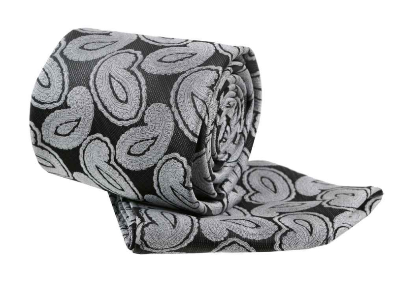 Kravatový set značky ORSI v šedých tónoch. Súprava kravaty a vreckovky do saka s paisley vzorom, šírka kravaty 8 cm.