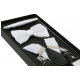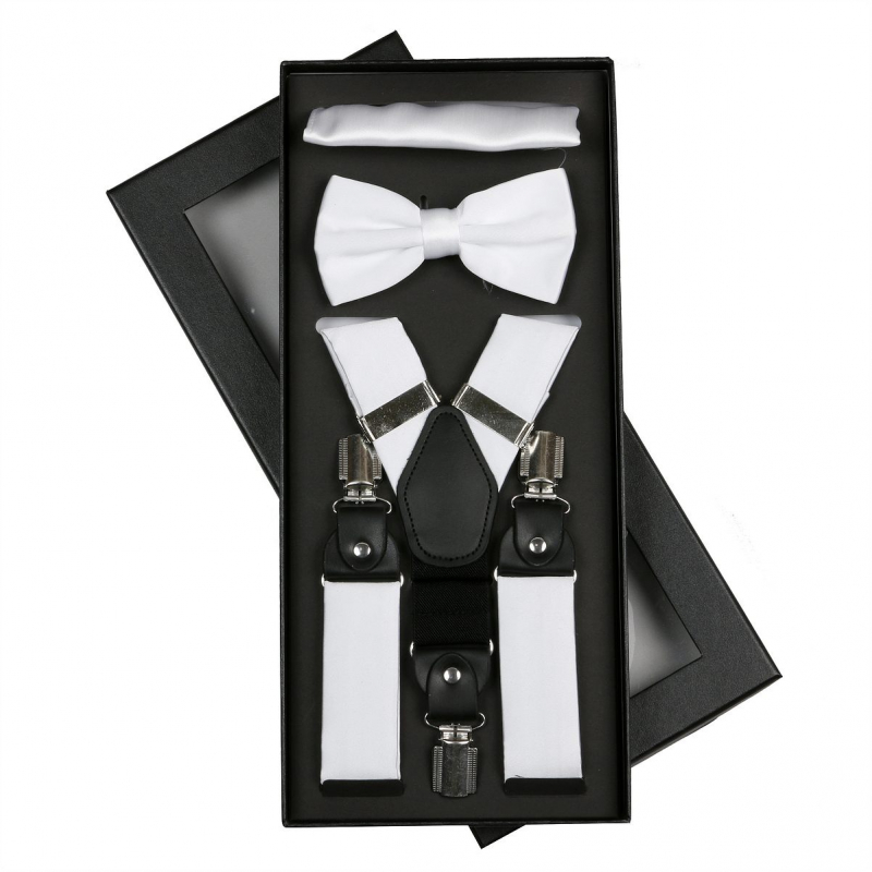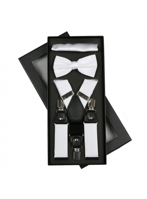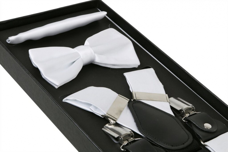 Pánska 3-dielna súprava traky, motýlik a vreckovka v darčekovej krabičke. Farba - biela. Jednofarebný hladký satén.