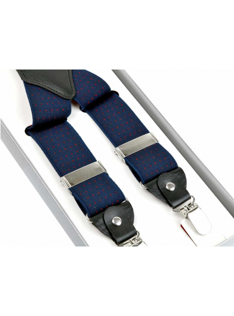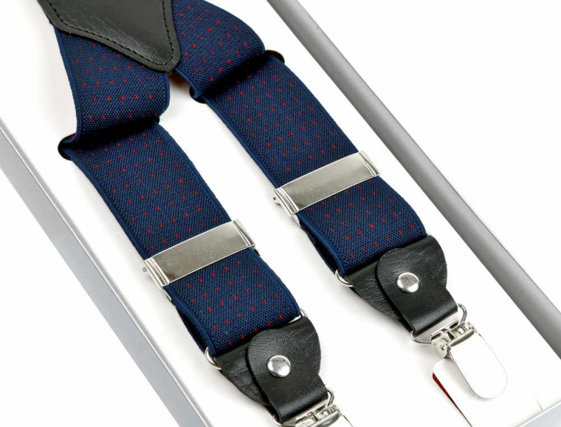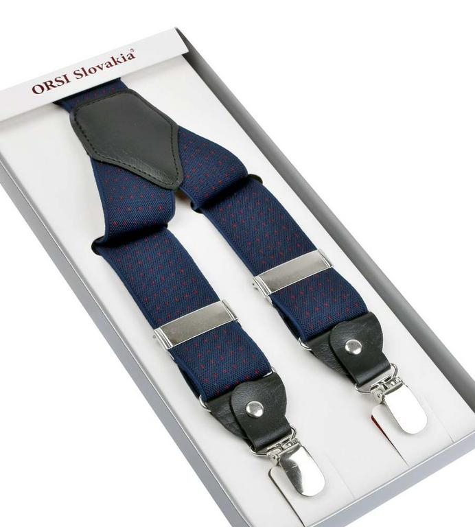 Pánske traky ORSI v krabičke - sýtomodré s červenými bodkami, šírka 3,5 cm, Celková dĺžka - 110 cm (vrátane kovových klipsov).
